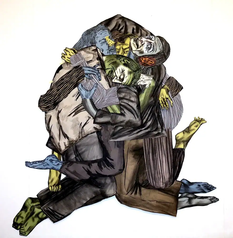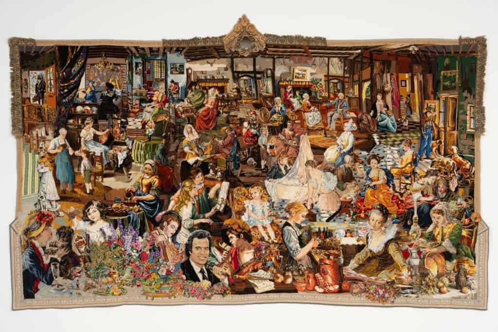 Aurélia Jaubert transforme des fragments de canevas, tissus et broderies chinés en vastes tapisseries foisonnantes, où se mêlent motifs populaires, références à l’histoire de l’art et imagerie contemporaine — comme un « collage textile » méticuleux et audacieux. Dans ses grandes tapisseries, Aurélia Jaubert fait danser la ligne, la trame et le motif. Le trait dessiné y devient fil à broder puis matière textile, et invite l’œil à voyager dans un paysage baroque où perspectives, trompes l’œil et imaginaire contemporain se rencontrent. Entre hommage aux « ouvrages de dames » et satire douce-amère de l’imagerie populaire, son œuvre redéfinit ce qu’est un dessin. Il s’agit ici non plus seulement de traits esquissés sur papier, mais de gestes qui se déploient dans une collusion et une prolifération de motifs et d’ornements assemblés.